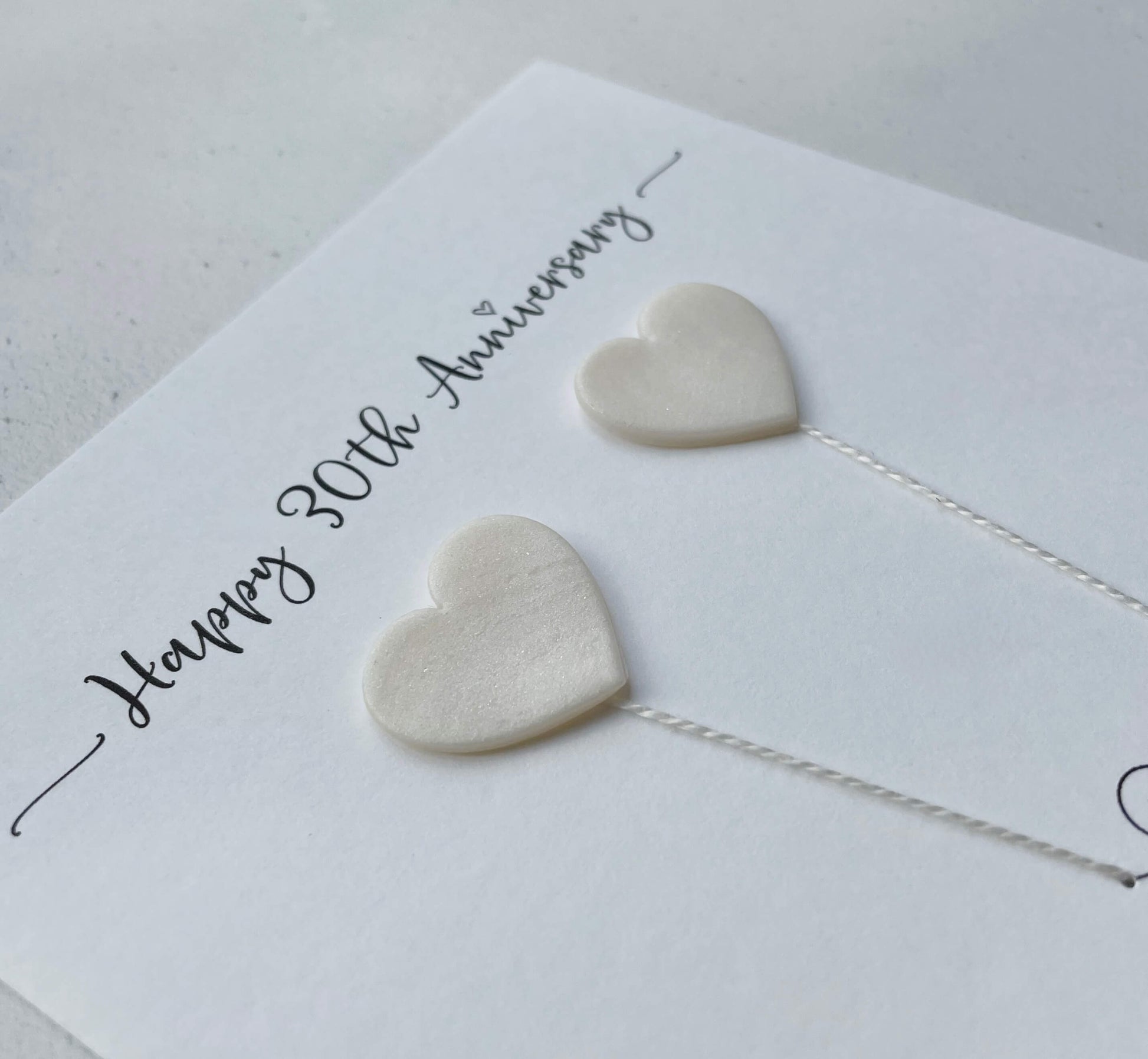 Celebrate your 30th wedding anniversary with this special personalised pearl 30th anniversary card. The personalisation makes it an extra special keepsake. Cute pearlescent polymer clay hearts adorn the card (not real pearls).