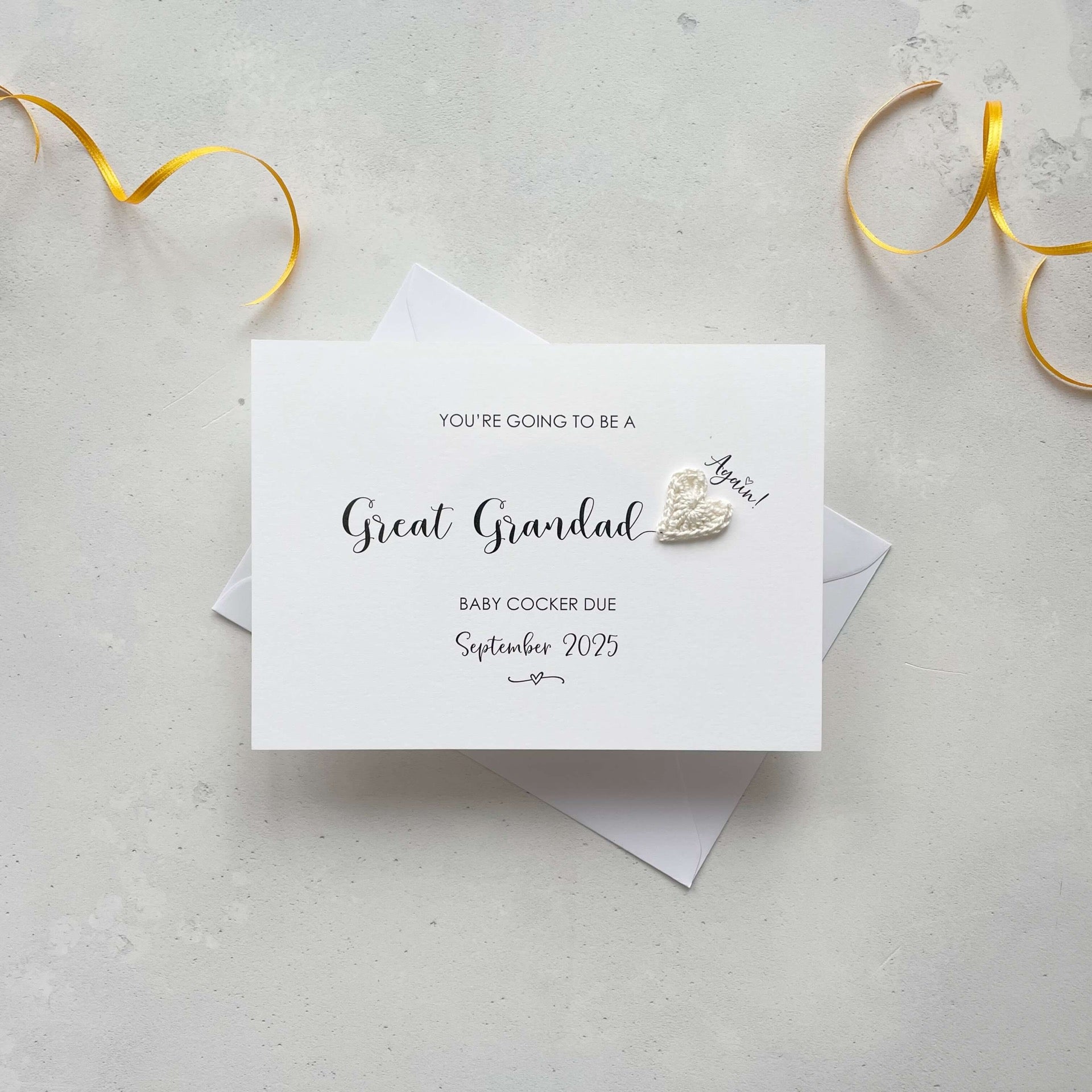 This card for Great Grandad is the perfect way to share the joyous news of an upcoming great grandchild. Its heartfelt beauty is accentuated with a lovingly crocheted heart. This special card is sure to be cherished for years to come!
