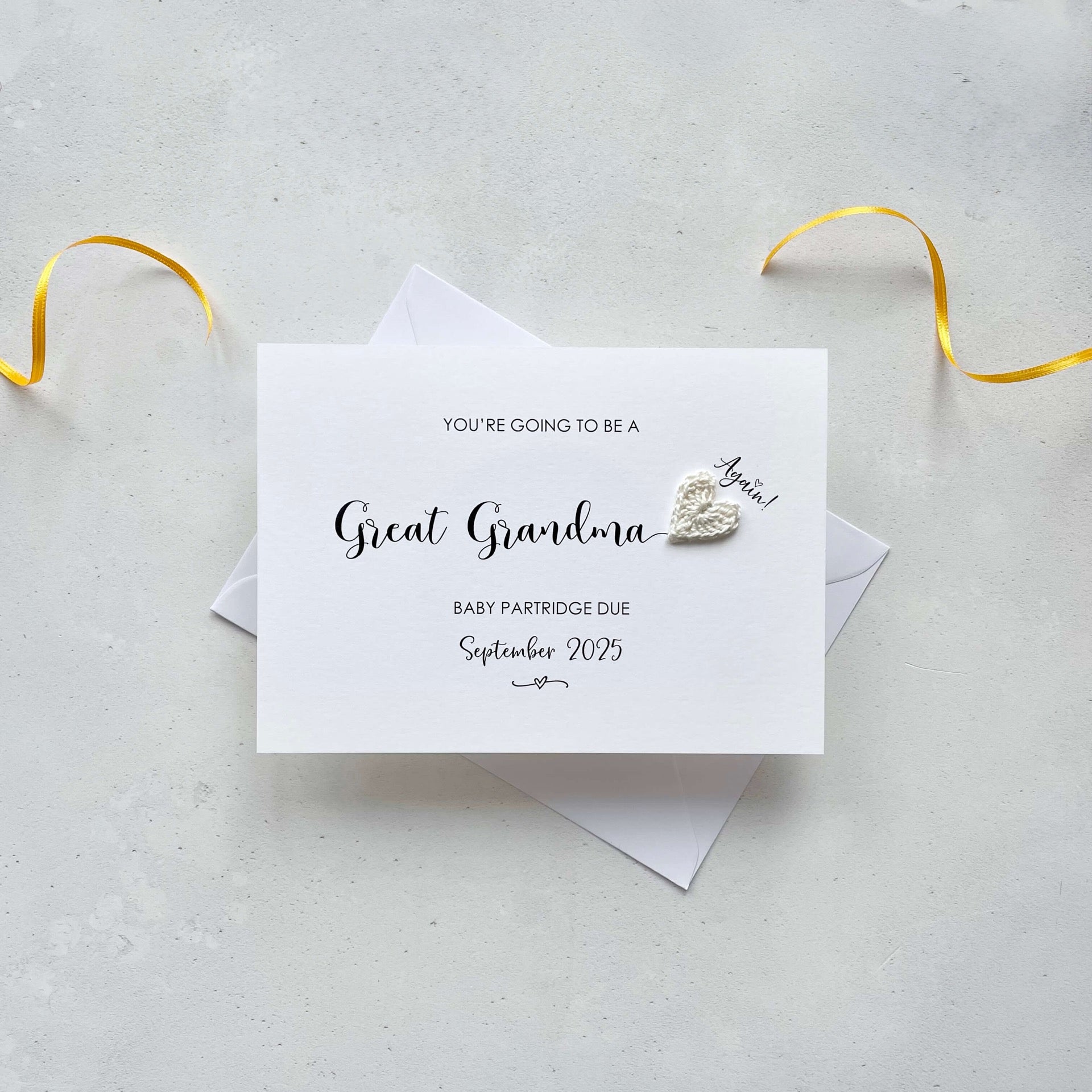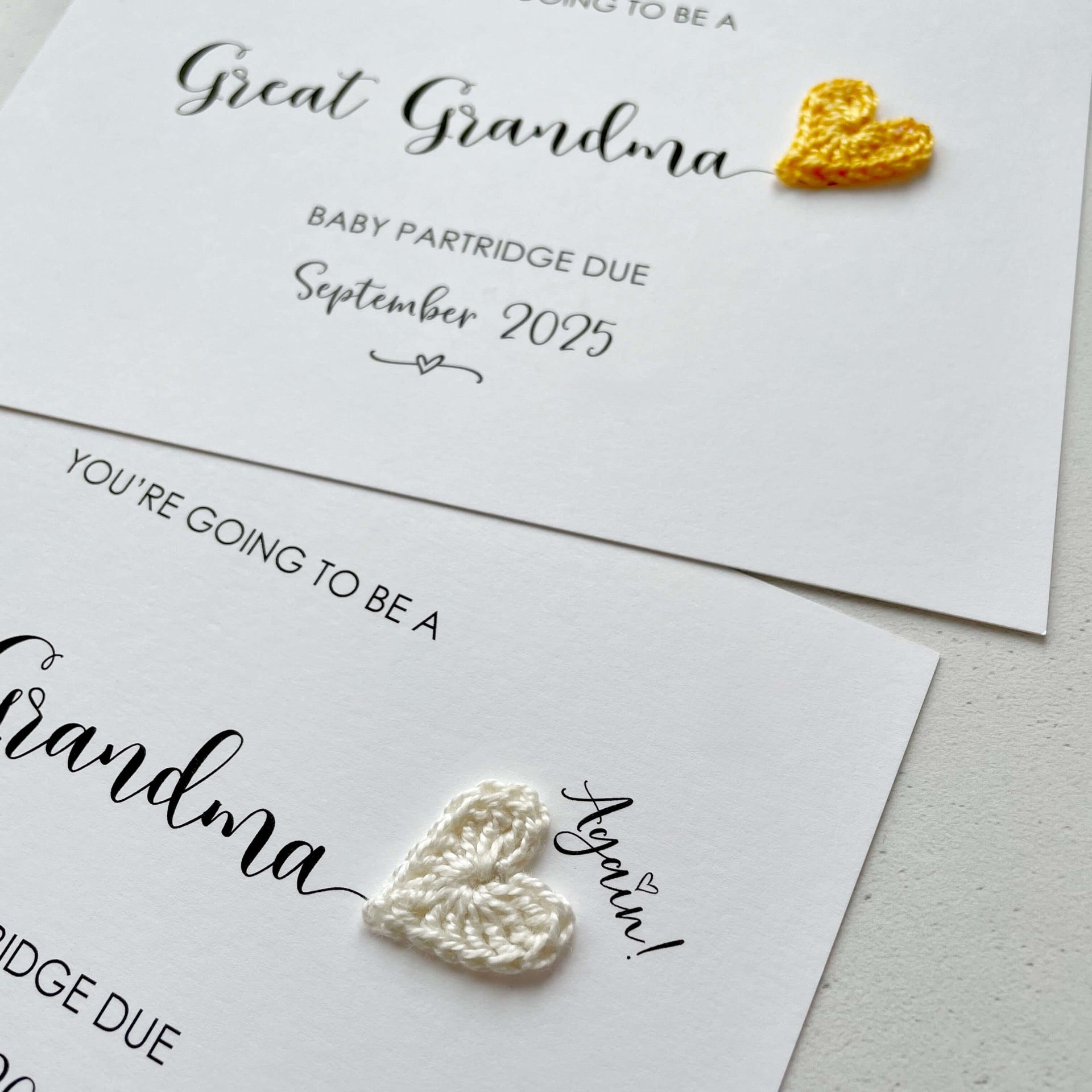 Show your love and excitement for the upcoming arrival and let Great Grandma know the exciting news with this beautiful greeting card! Handcrafted with a crochet heart, it’s a truly heartwarming way to celebrate this joyous news.
