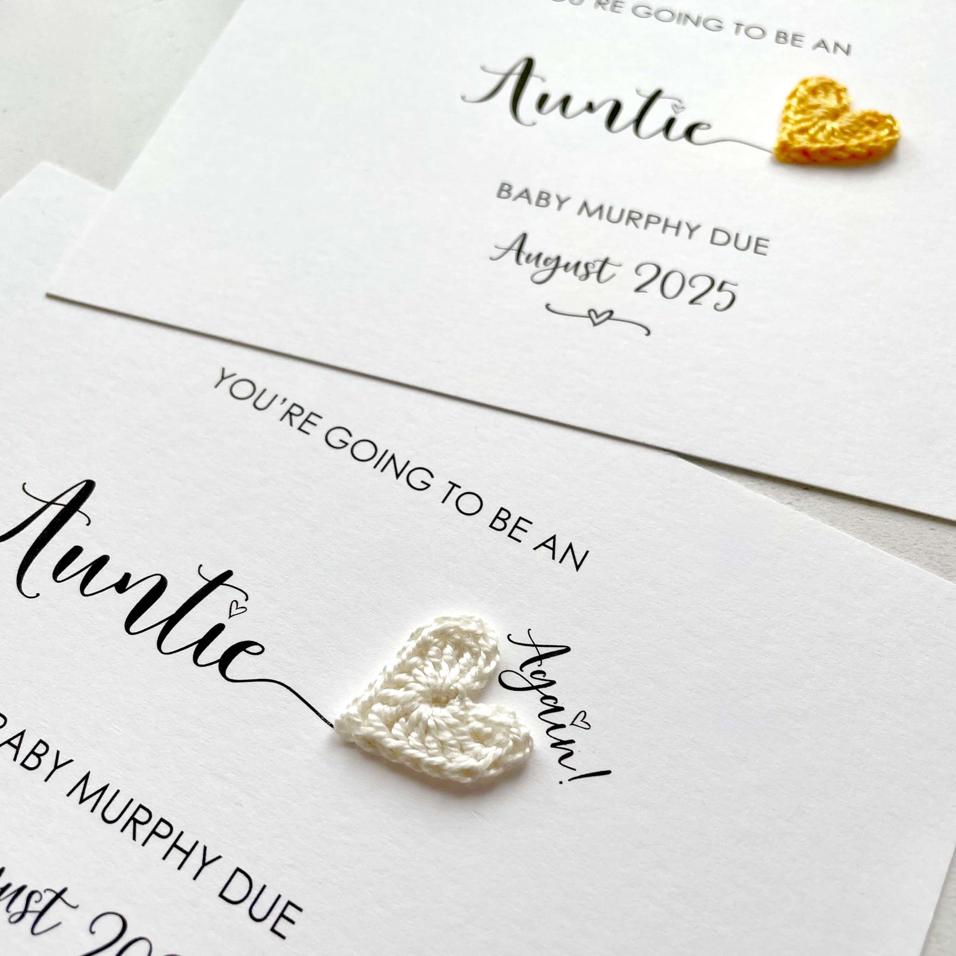 Show your soon-to-be-Auntie she's in for a treat with this beautiful, one-of-a-kind card. Lovingly crafted and finished with a cute crochet heart, you can ensure she knows how special she is and how excited you are for her.