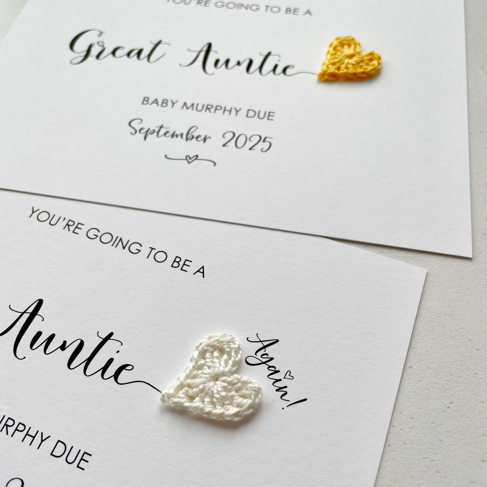 Show your soon to be Great Auntie she's in for a treat with this beautiful, one-of-a-kind card. Lovingly crafted and finished with a cute crochet heart, you can ensure she knows how special she is and how excited you are for her.