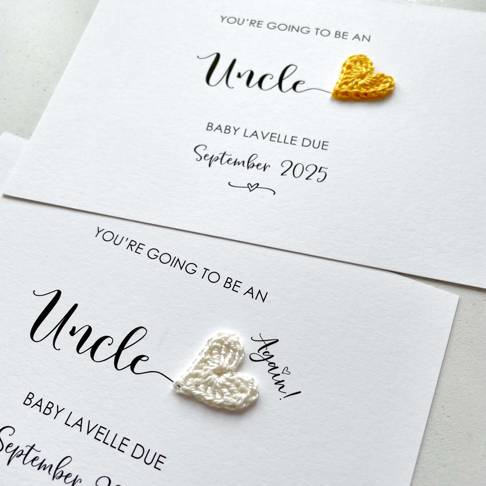Welcome a new Uncle into the family with this sweet You're Going to be an Uncle card. Finished with a crochet heart, it's the perfect way to share the news they'll cherish forever.